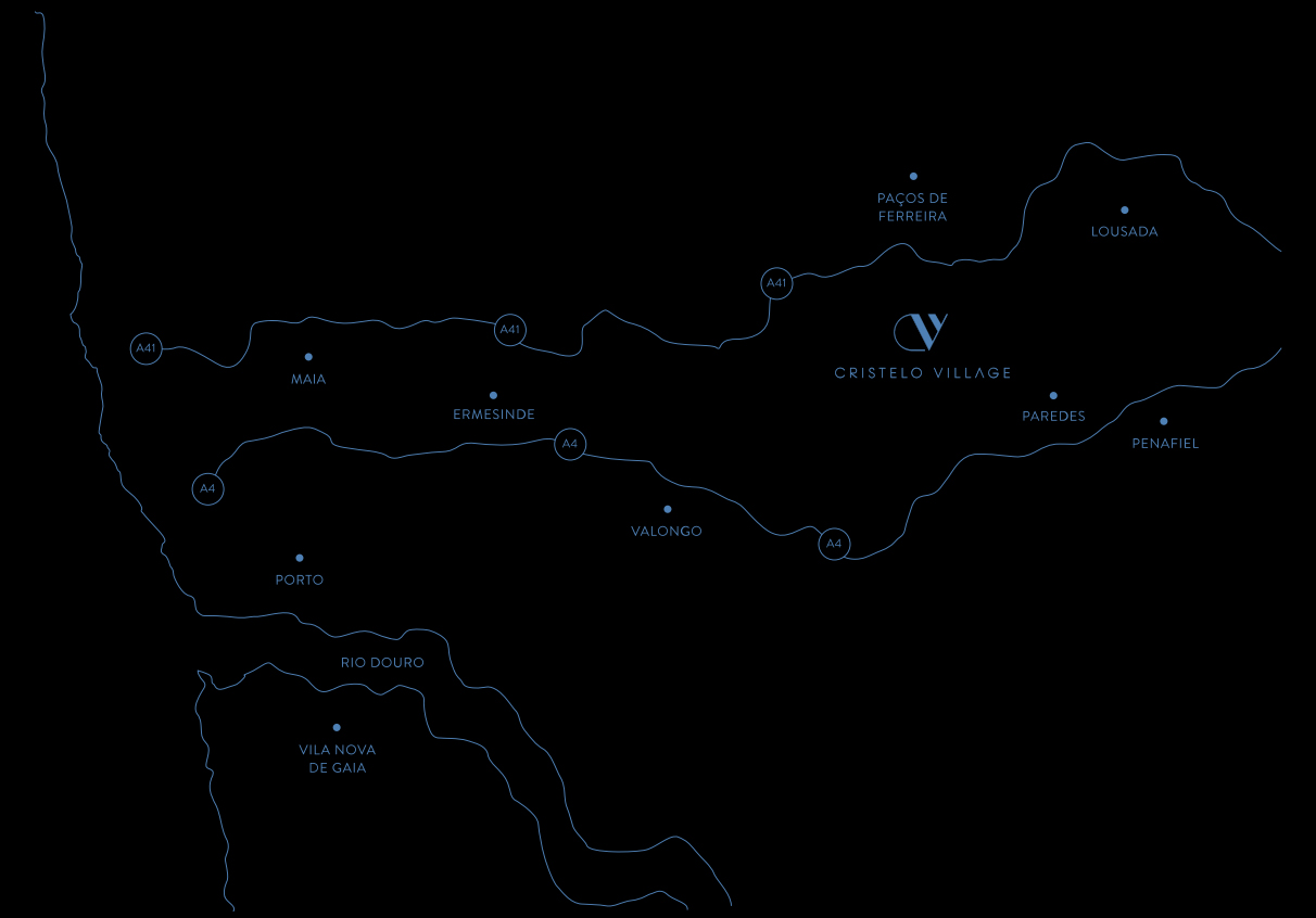 O Cristelo Village está situado entre dois dos concelhos mais vibrantes do interior do distrito do Porto. Proporciona assim uma excelente localização e acessibilidade, estando ligado por duas autoestradas que facilitam o acesso e o colocam a poucos minutos das principais saídas internacionais, como o Aeroporto Francisco Sá Carneiro e o Porto de Leixões. Paredes e Paços de Ferreira contam com uma das populações mais jovens do país.